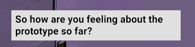 Overall, I would consider my playtest as a success, and I will use this as a chance to improve and develop upon my new ideas for the next prototype. I am planning on fixing the dialogue up a bit and figure out how to display the buttons in a more appealing way.